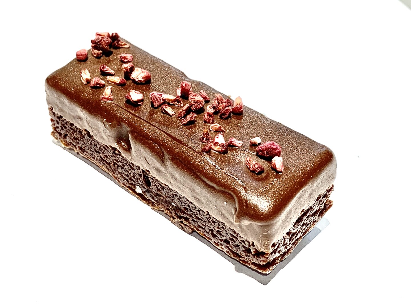 Brownie cu piureu din zmeura, cu zmeura sublimata, lapte si ciocolata neagra.